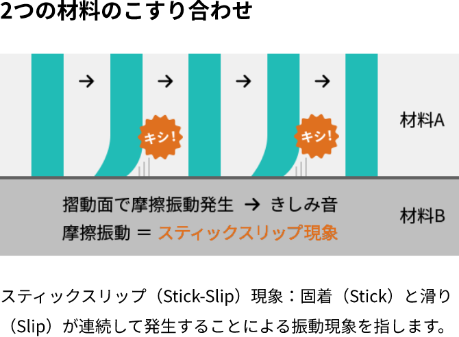 2つの材料を擦り合わせた際の摩擦振動(スティックスリップ現象)によりきしみ音が発生します。