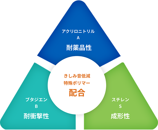 既存のABS樹脂に独自開発した特殊ポリマーを配合することで篏合部をなめらかに滑らせ、きしみ音を抑制します。